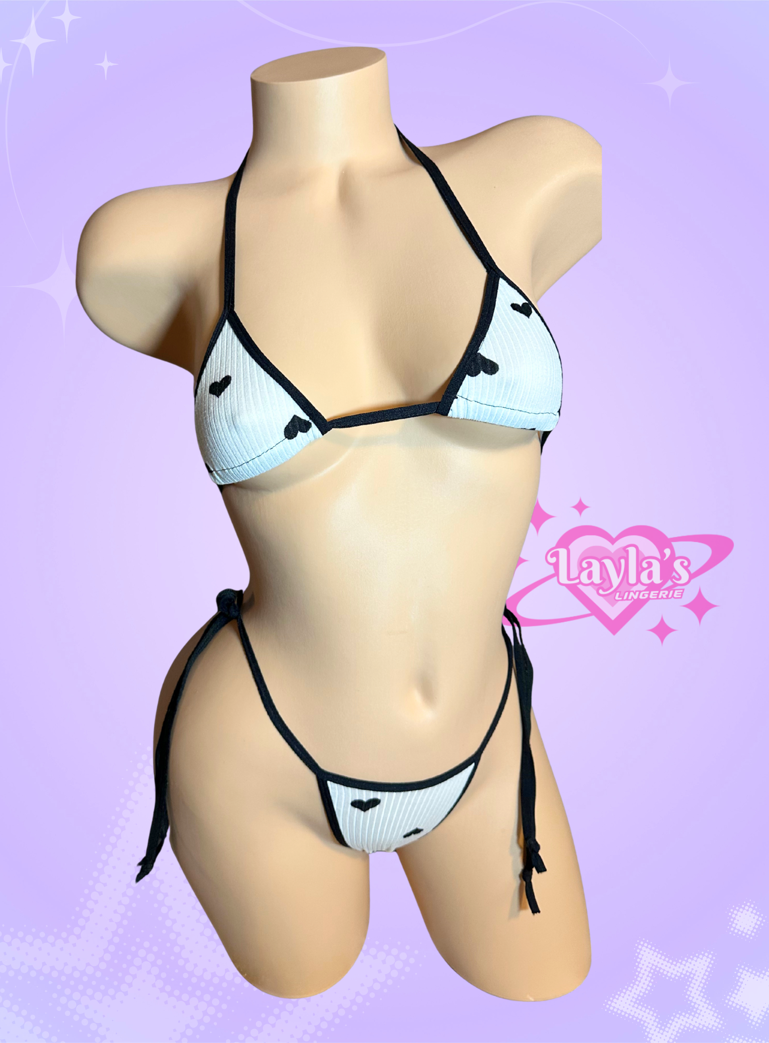 Black and white ribbed knit bikini. Exact placement of the heart pattern will vary between each bikini ❤️ not intended to be used as swimwear.