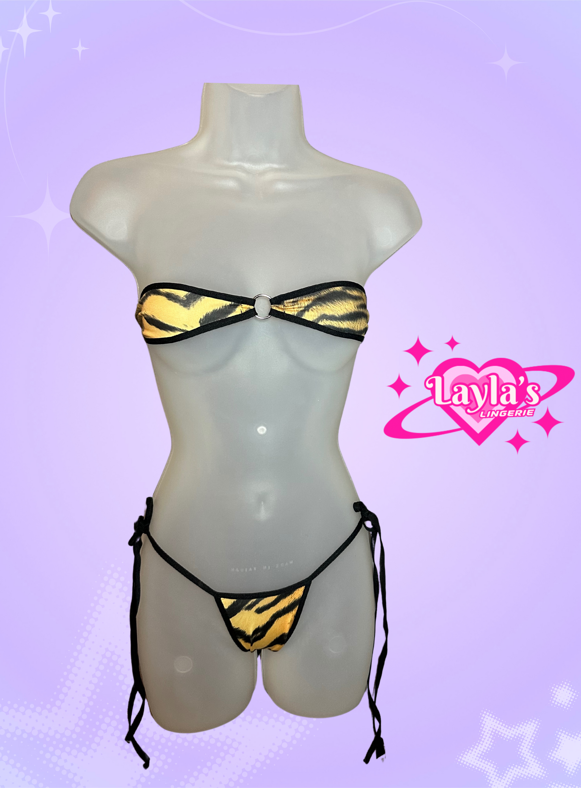 Tiger print, tie-back tube top with o-ring in the middle and thong bottoms.