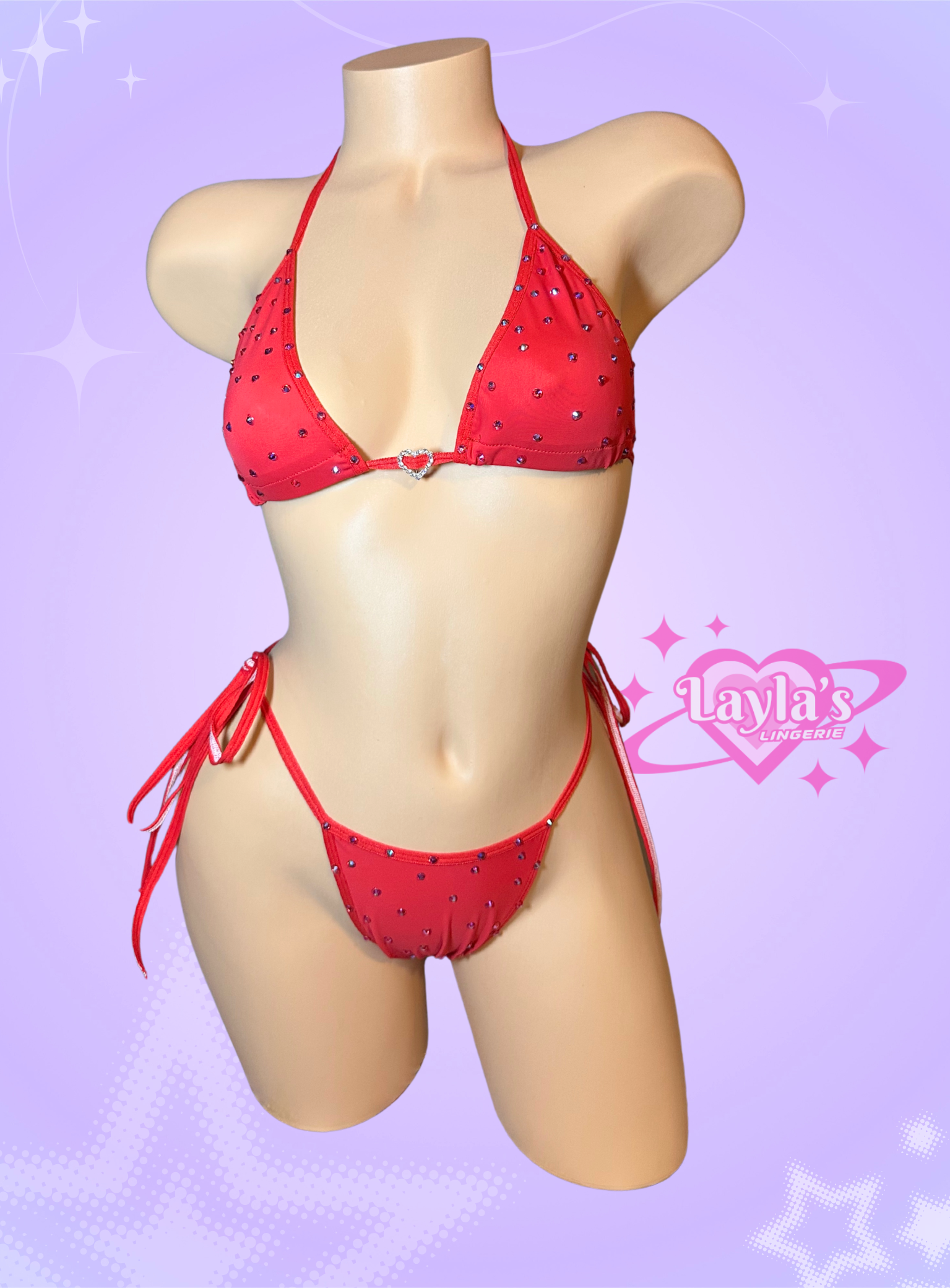 Two piece red thong bikini set with red rhinestones. Not intended to be used as swimwear