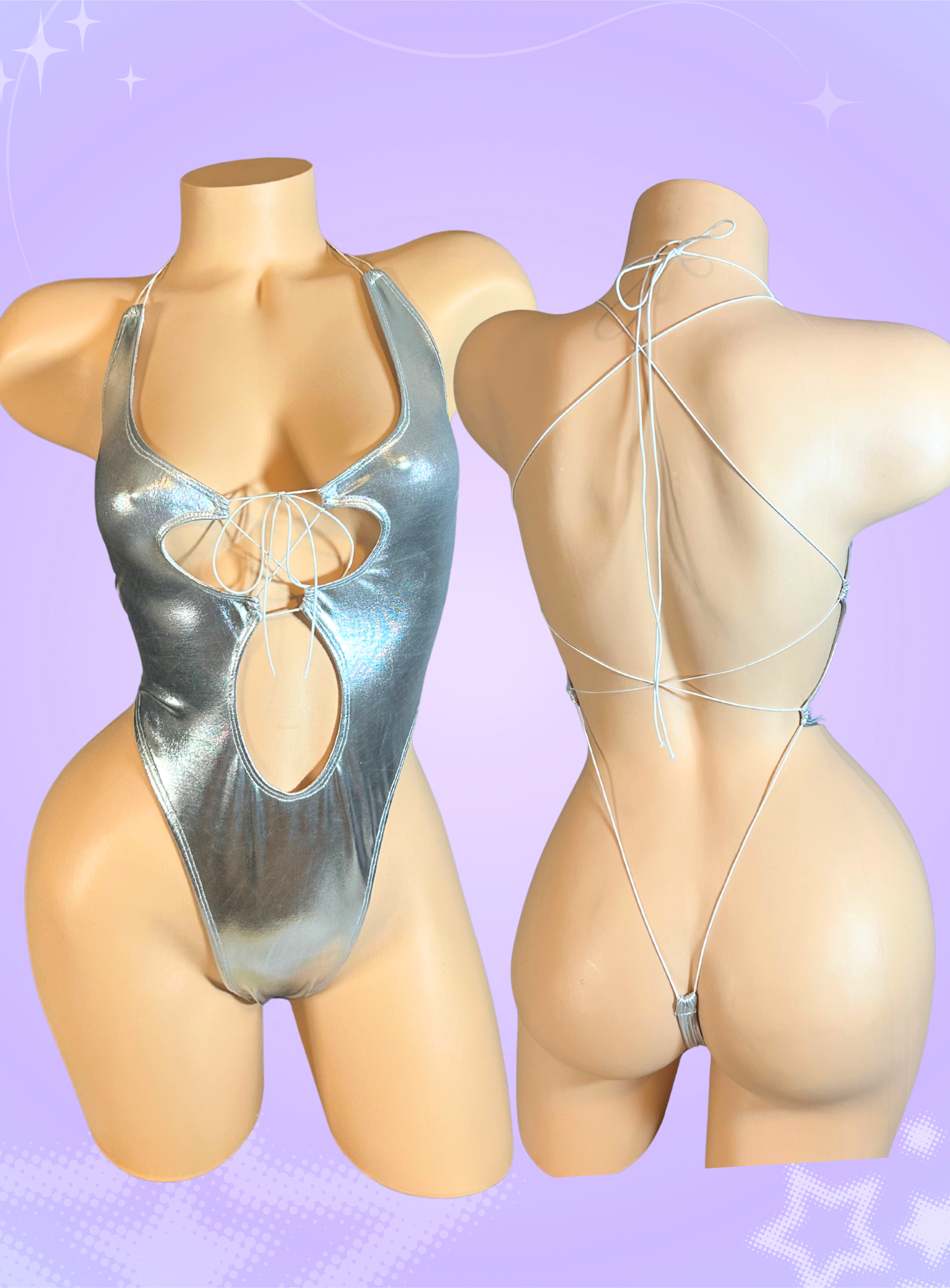 Silver one piece with a drawstring in the front to adjust/tighten the bodysuit as well as adjustable strings to tie the back. One size fits most.