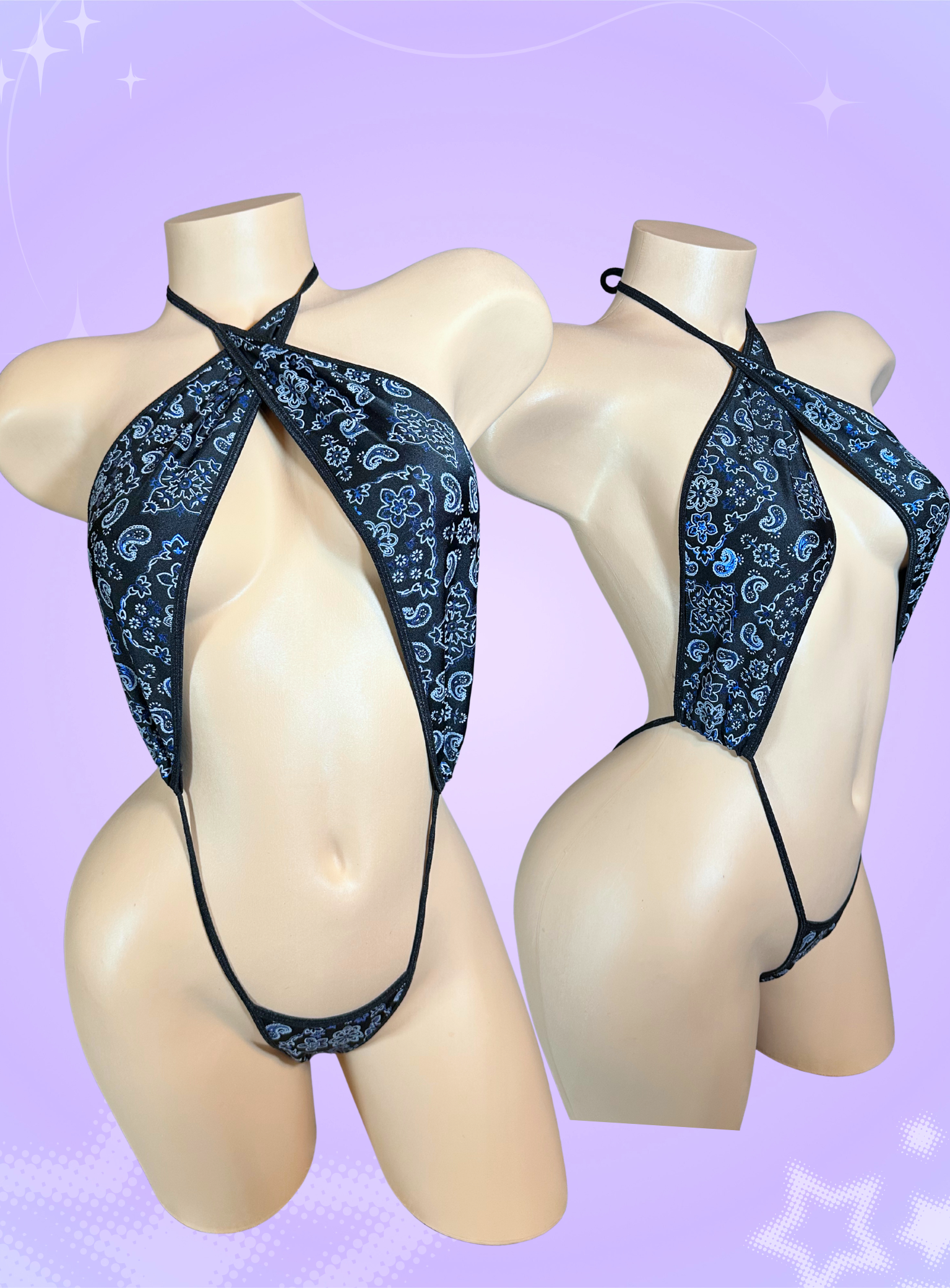 The Asha One piece in a black paisley print fabric with holographic blue accents throughout. This is made from swim material and ready to be used at the pool or beach.