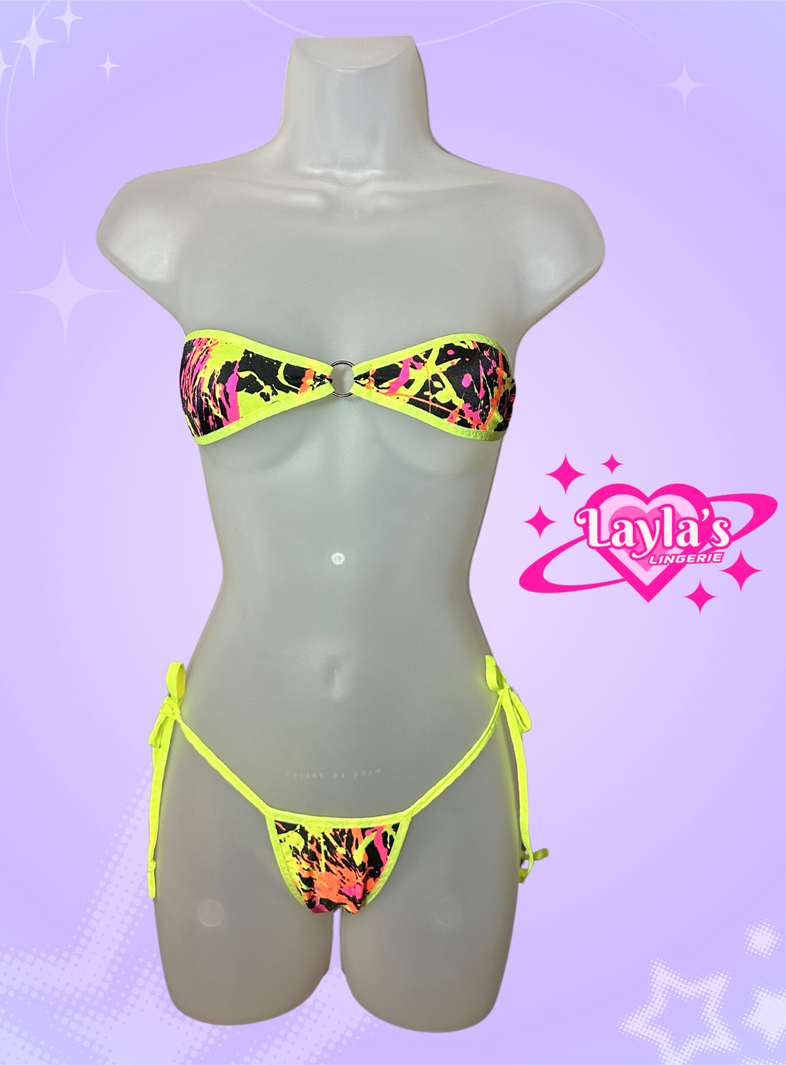 Retro neon pattern, tie-back tube top with o-ring in the middle and thong bottoms.