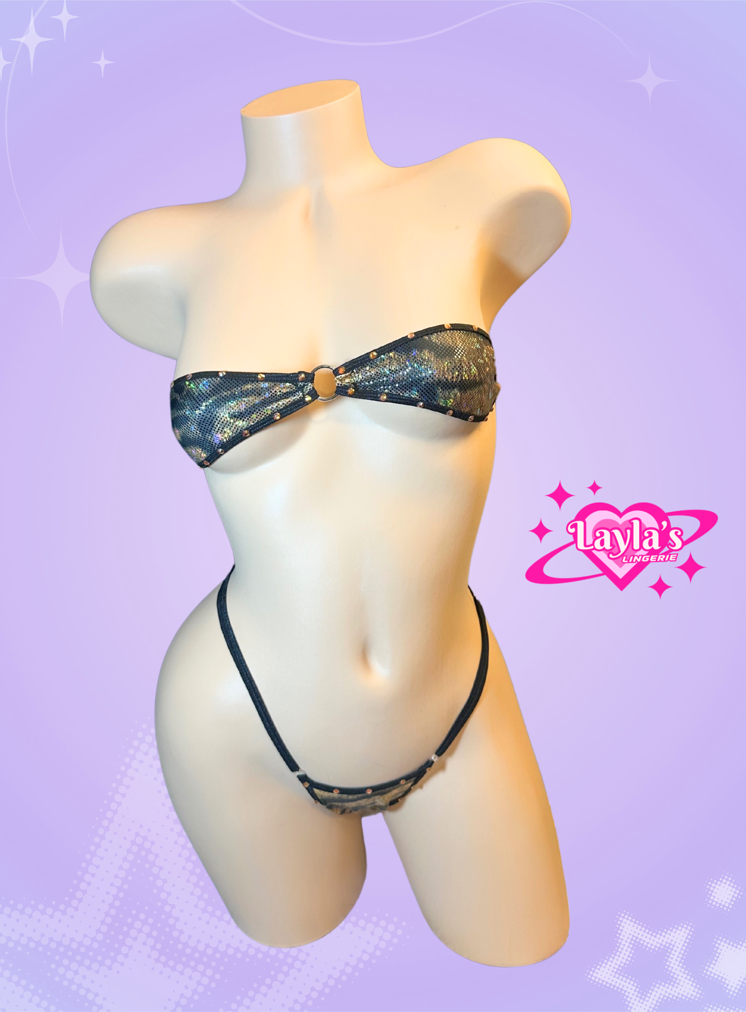 The Gianna Bikini 2 piece set in a holographic tiger print, with rhinestones lining the borders.