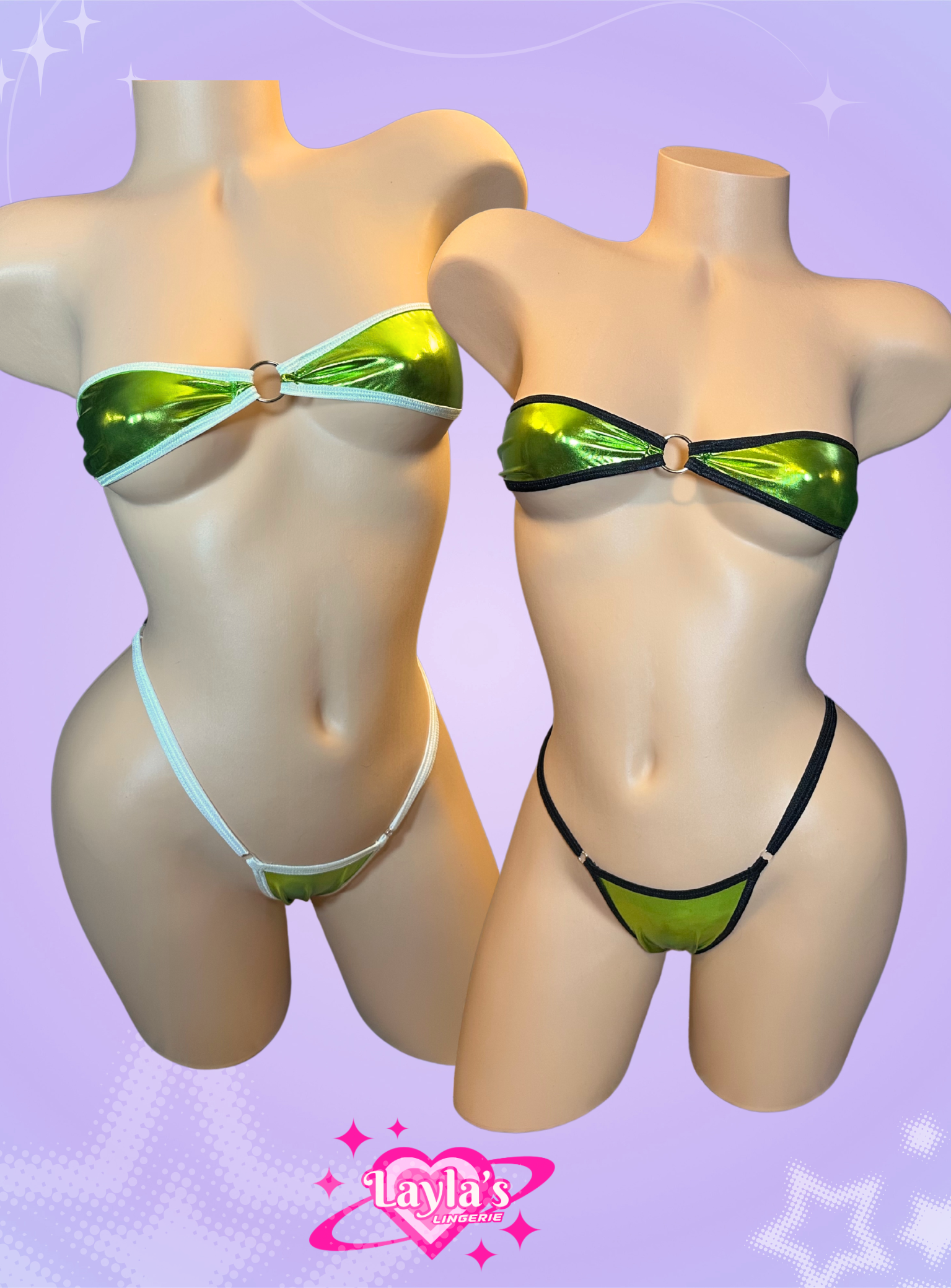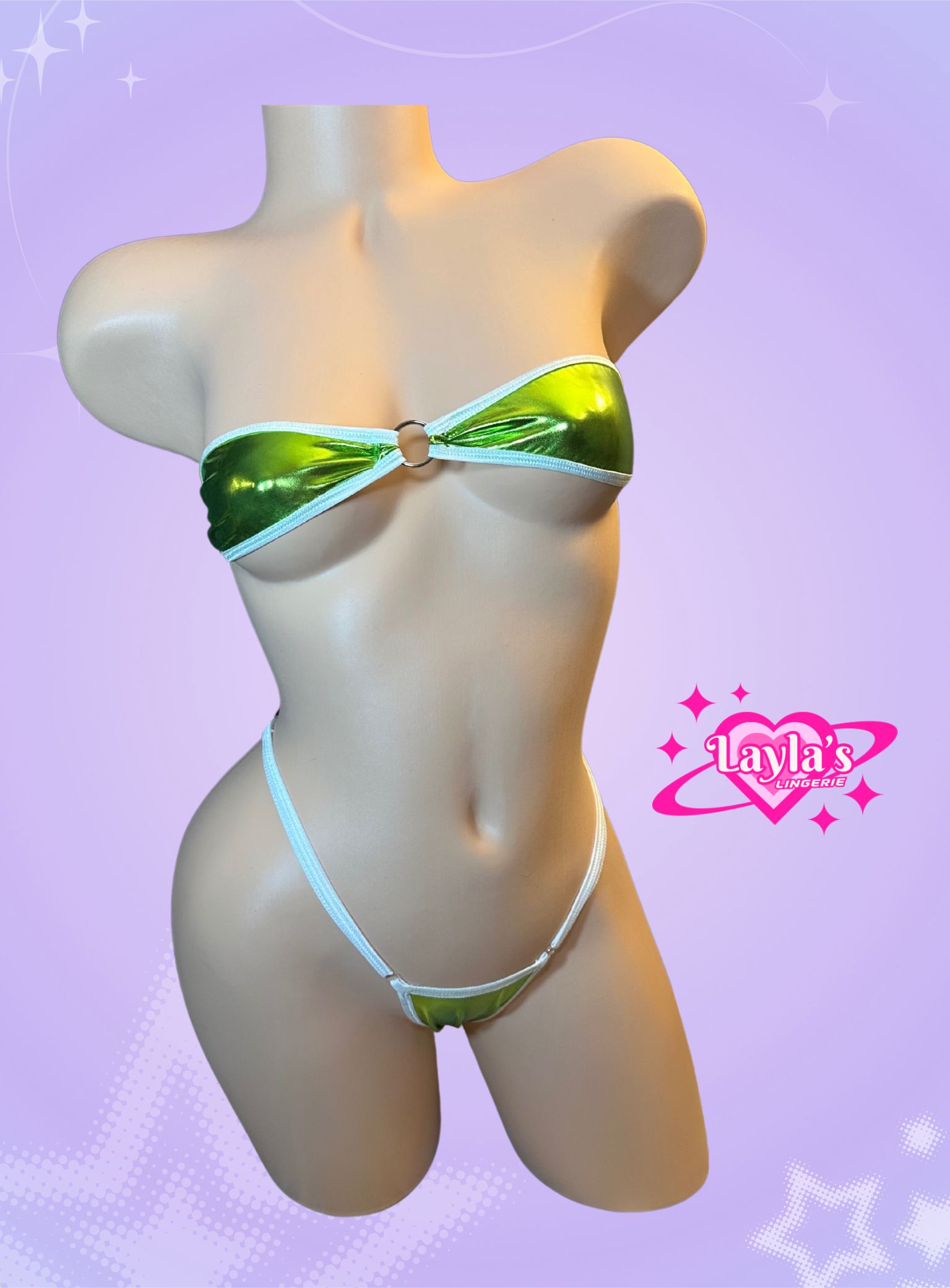 Green tie back tube top with o-ring in the middle and thong bottoms.