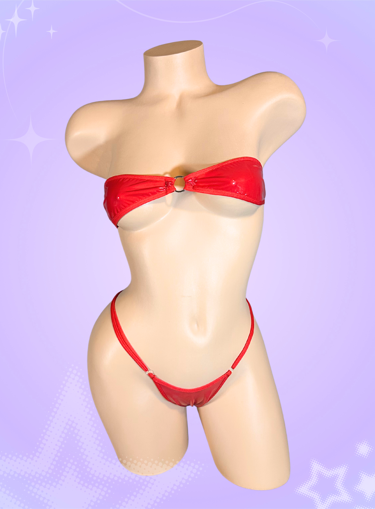 The gianna 2 piece thong bikini with a tube top that ties in the back in a red faux latex vinyl stretchy material. Not intended to be used as swimwear.