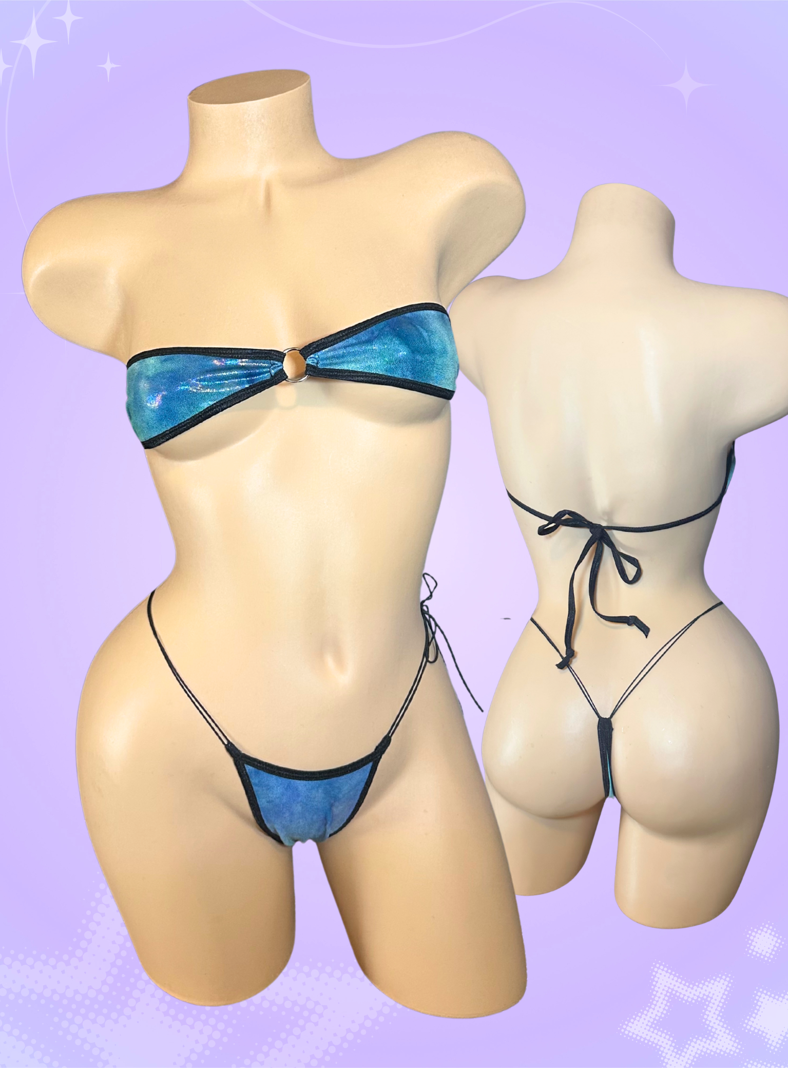 The Gianna two piece thong bikini and tube top in a blue and black tie dye fabric with an oil slick holographic effect and black binding