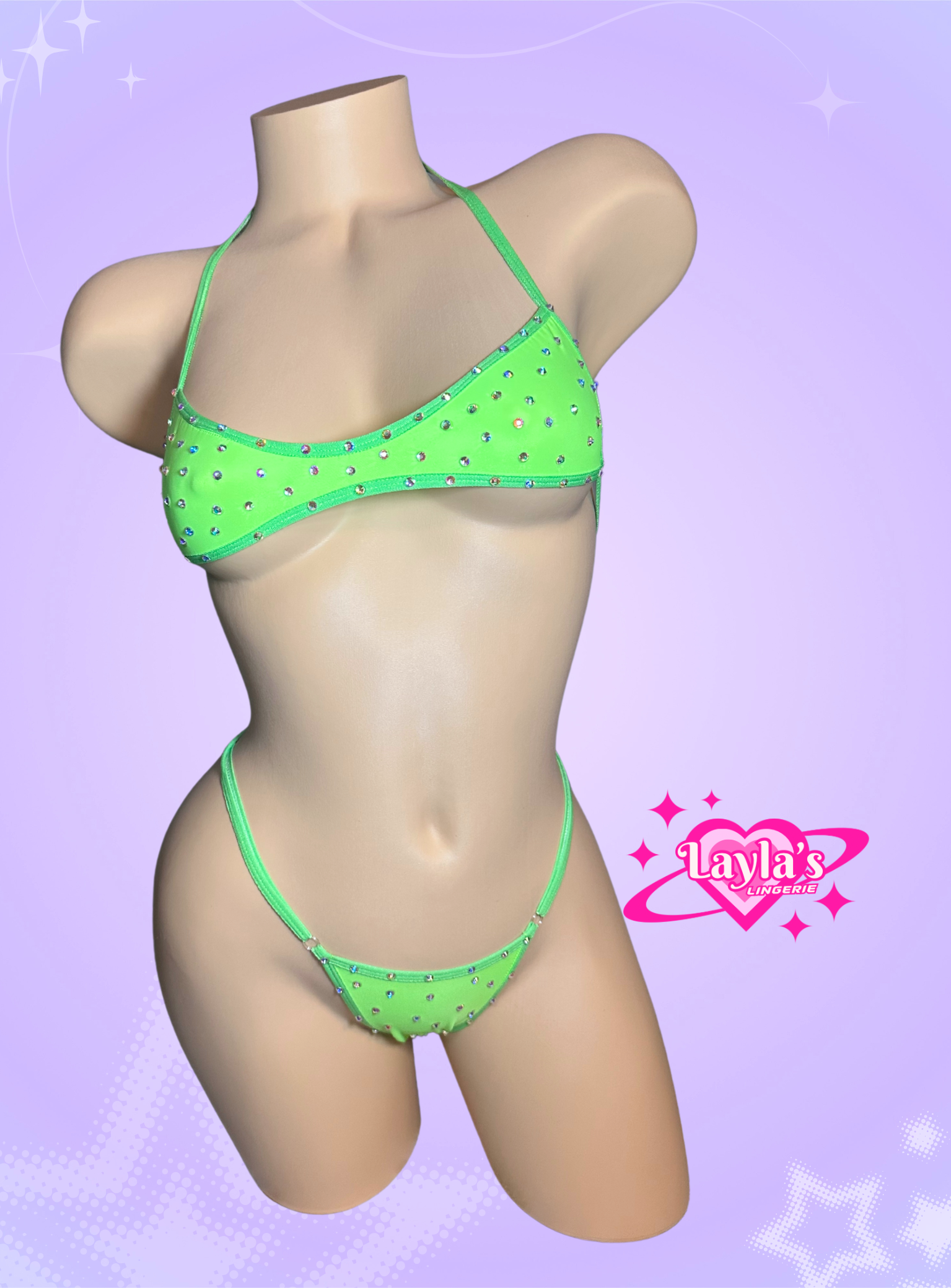 Neon green two piece set with a unique- shaped top and thong bottoms. Covered by hand in rhinestones. Exact rhinestone placements will may vary.