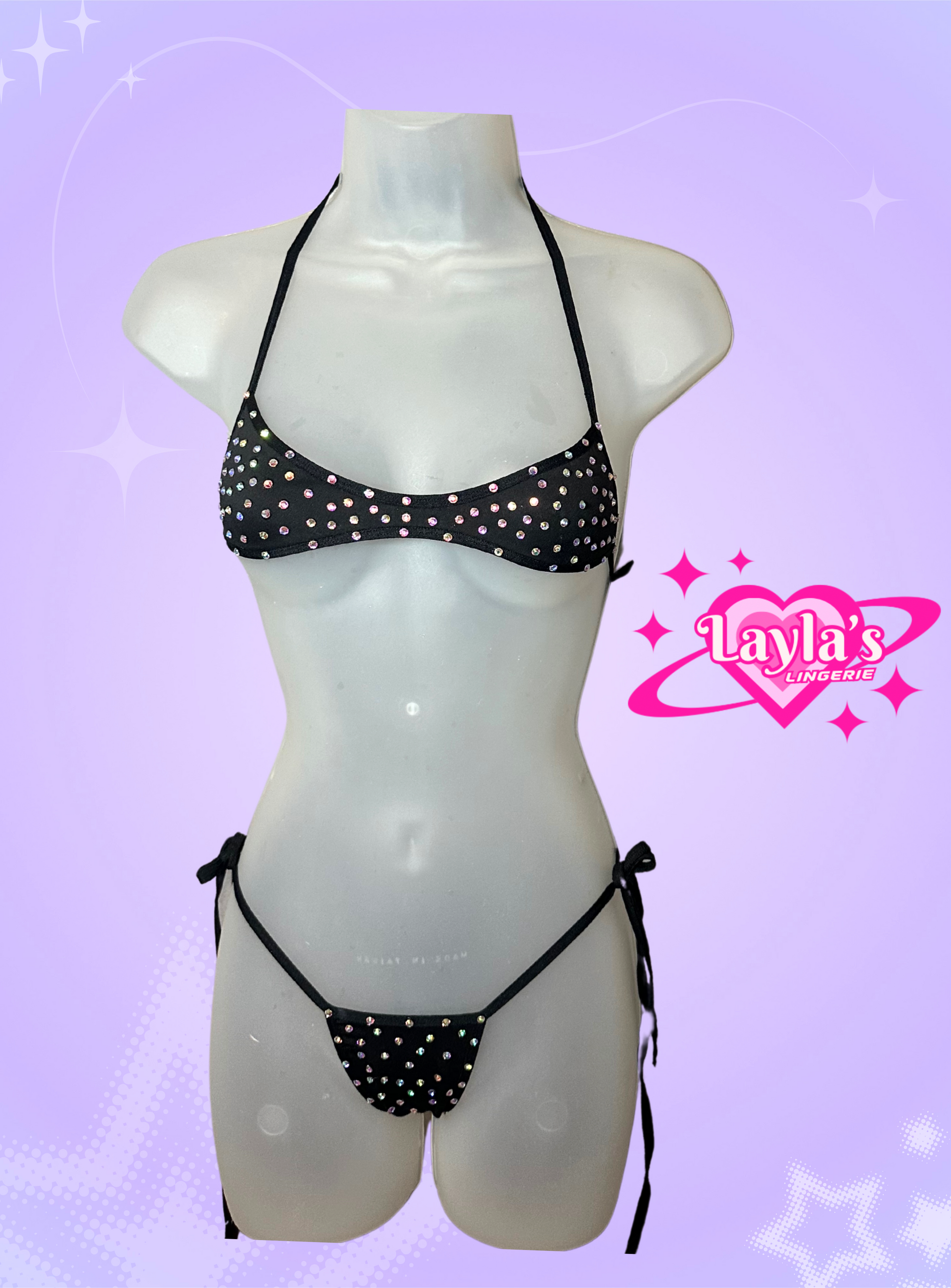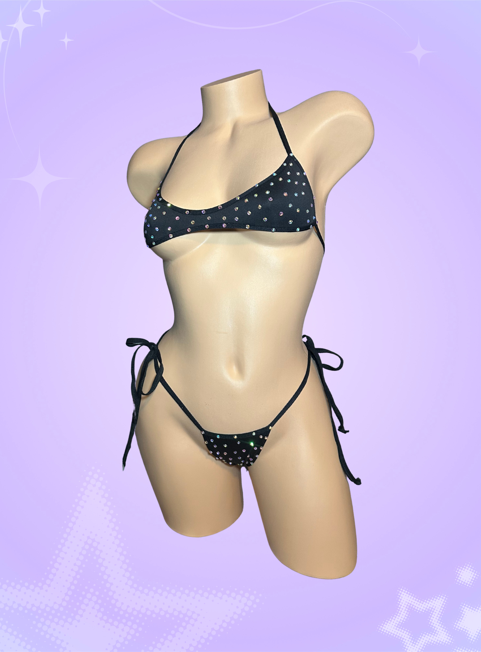 Black two piece set with a unique- shaped top and thong bottoms.