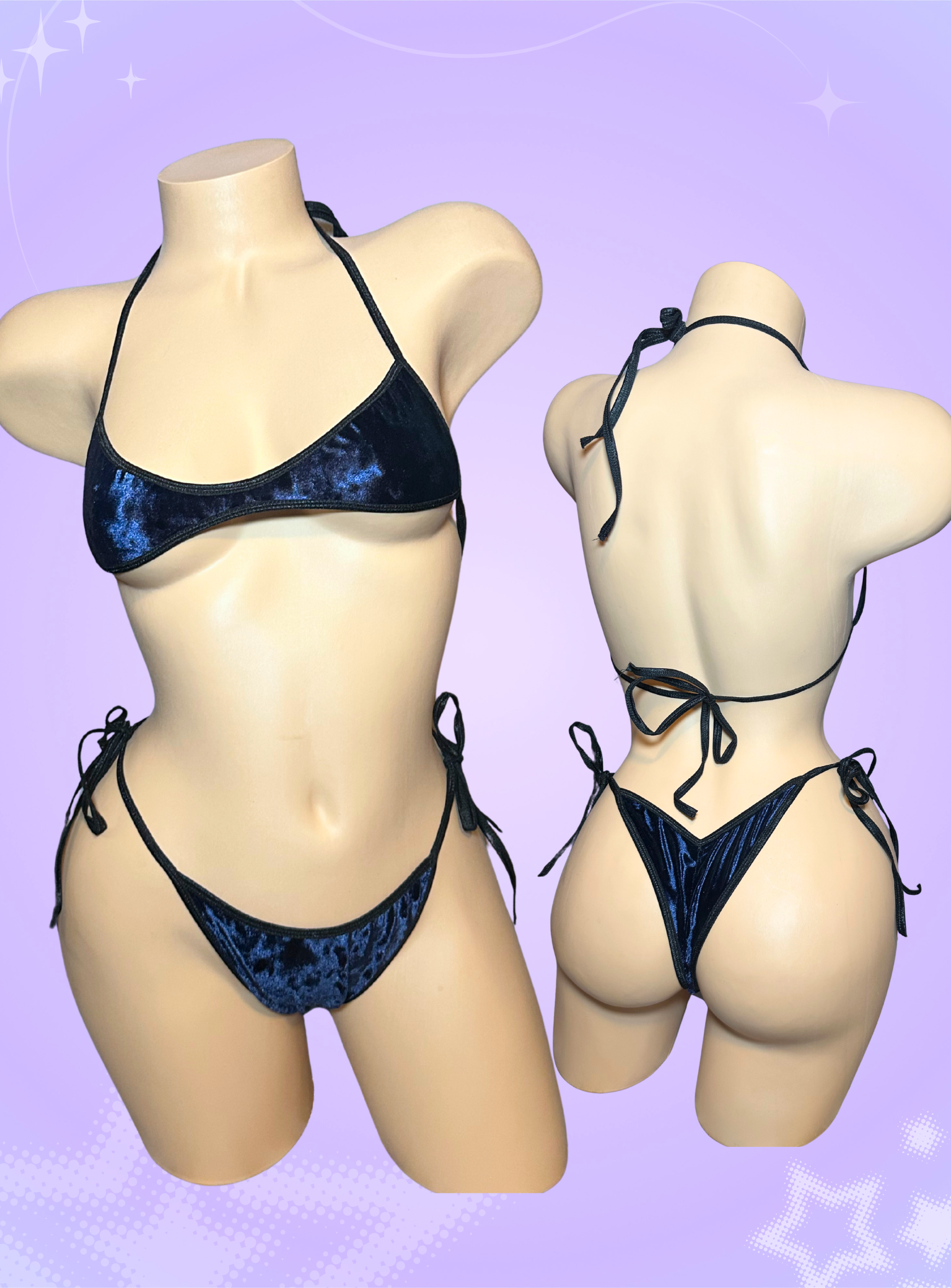 The jade 2 piece bikini in a deep blue velvet and black. The bottoms are a cheeky style with a scrunch butt added.