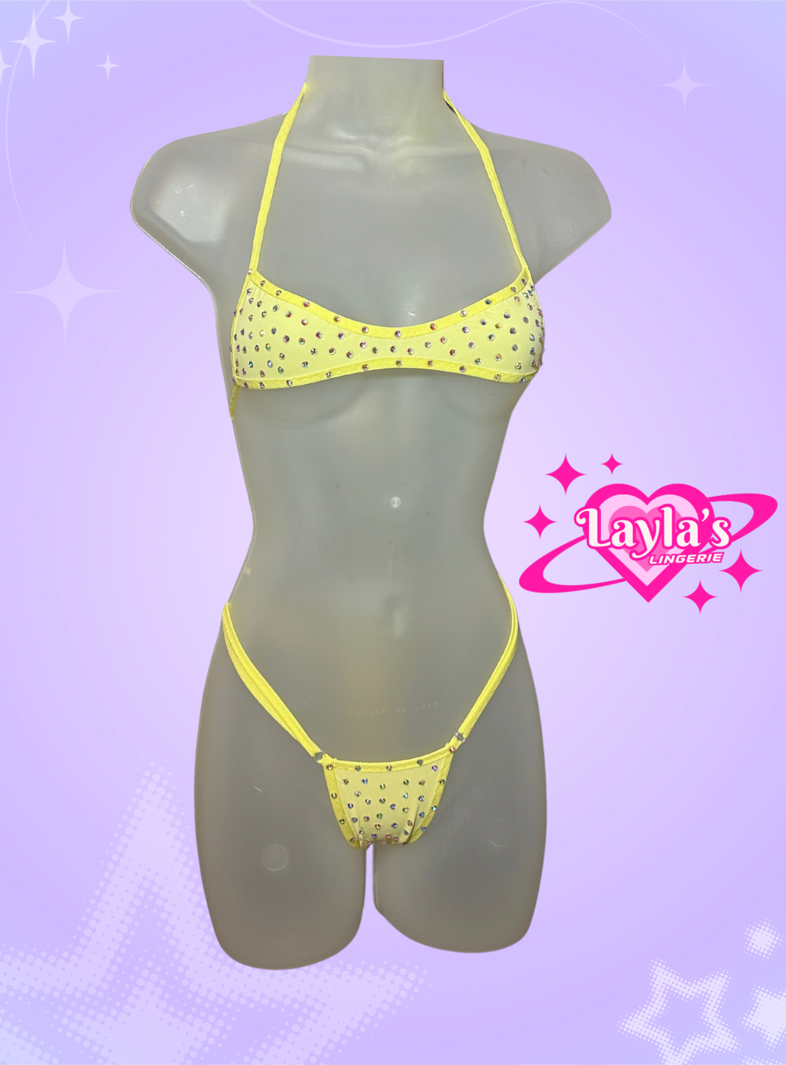 Yellow two piece set with a unique- shaped top and thong bottoms.
