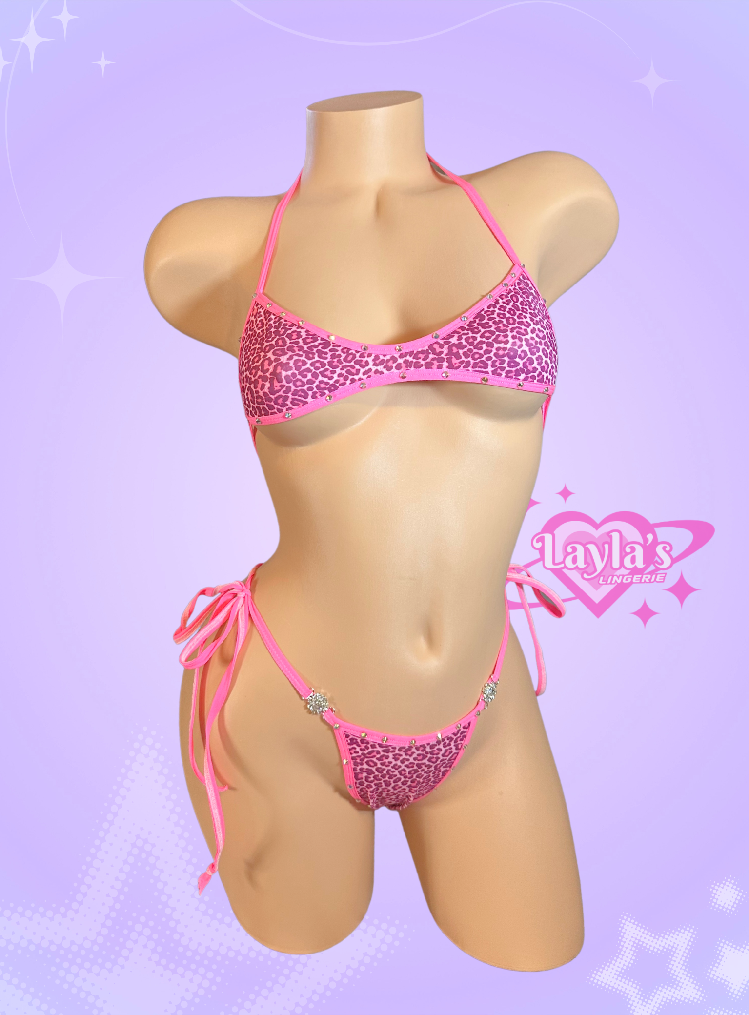 Pink cheetah print bikini with rhinestone edges, two piece set with a unique- shaped top and thong bottoms. Exact pattern and rhinestone placement may vary on each bikini. Not intended to be used as swimwear!