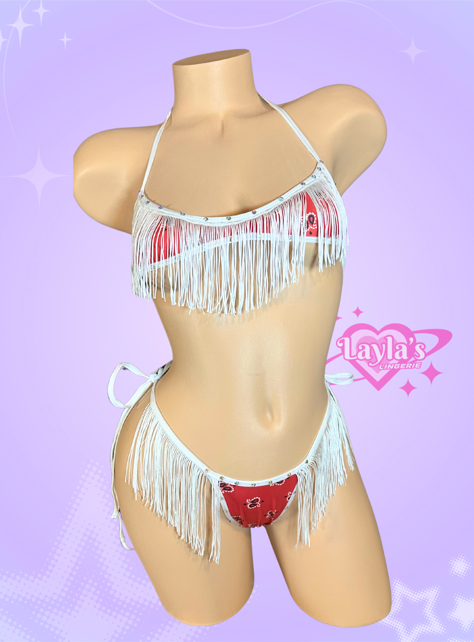 The jade bikini in a red paisley with white trim and white fringe, and hand placed rhinestones lining the border