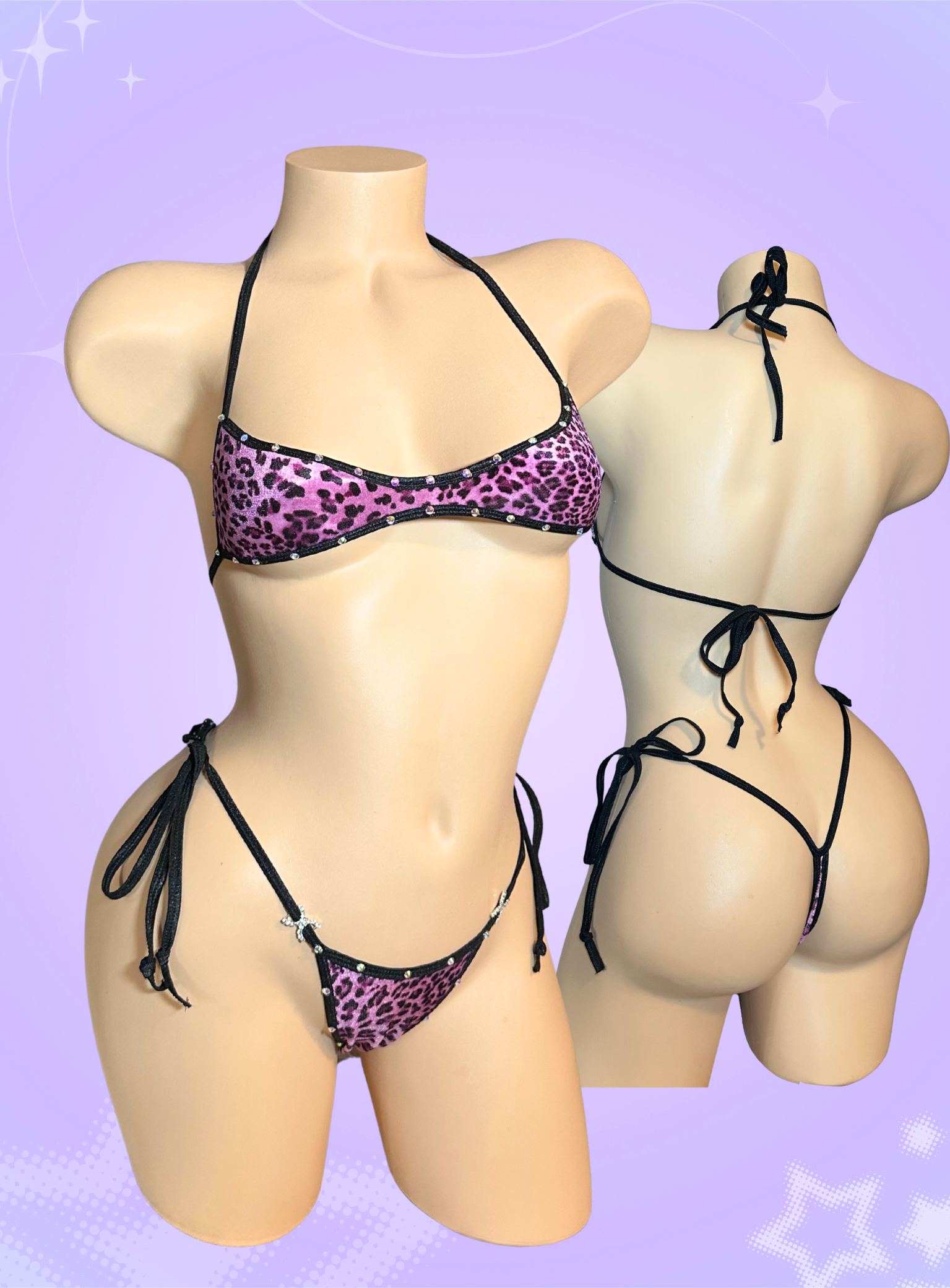 The jade 2 piece set in a purple velvet cheetah print fabric and rhinestones lining the edges.