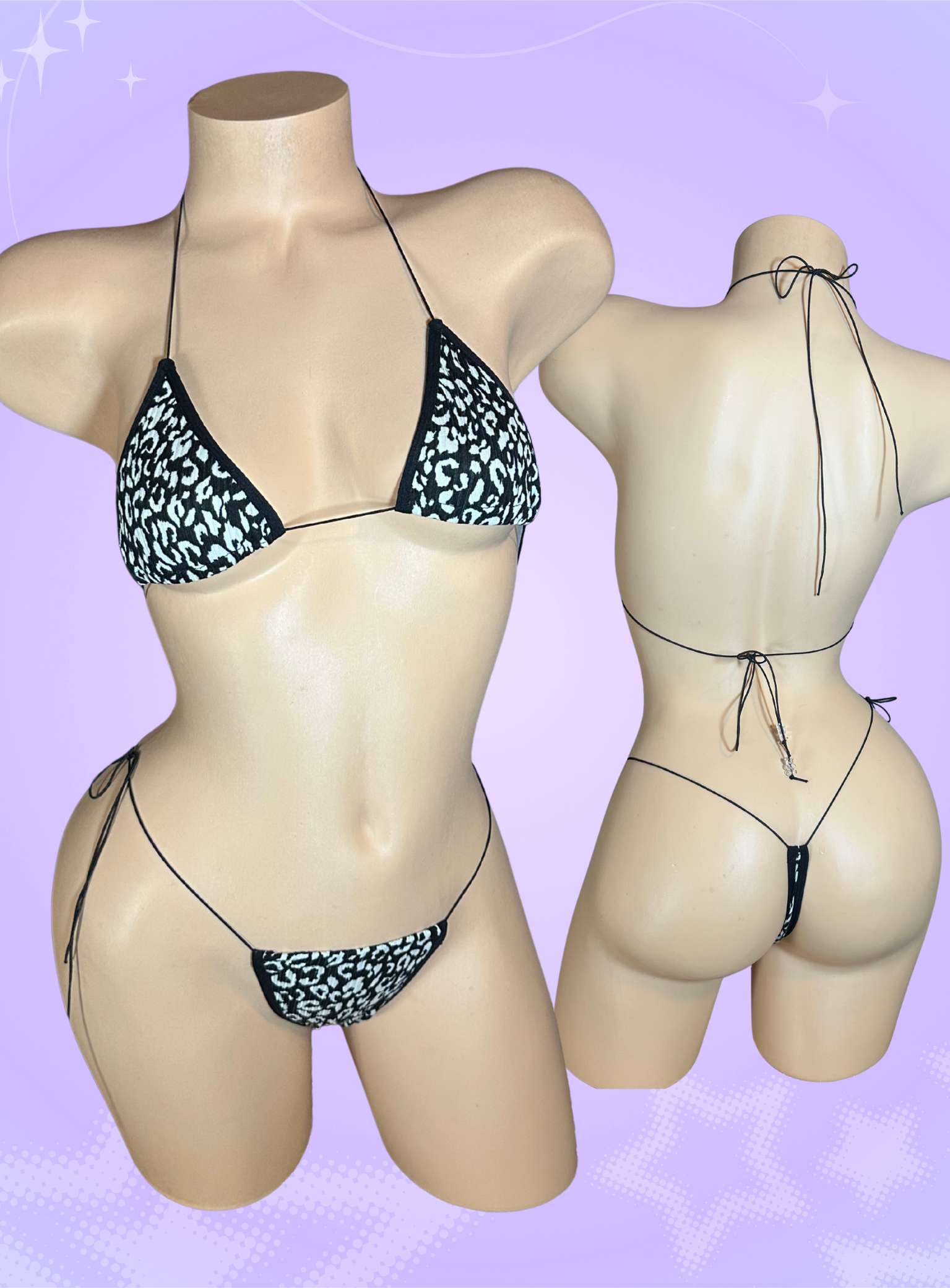 The Nova Microkini in a ribbed black and white leopard print fabric.