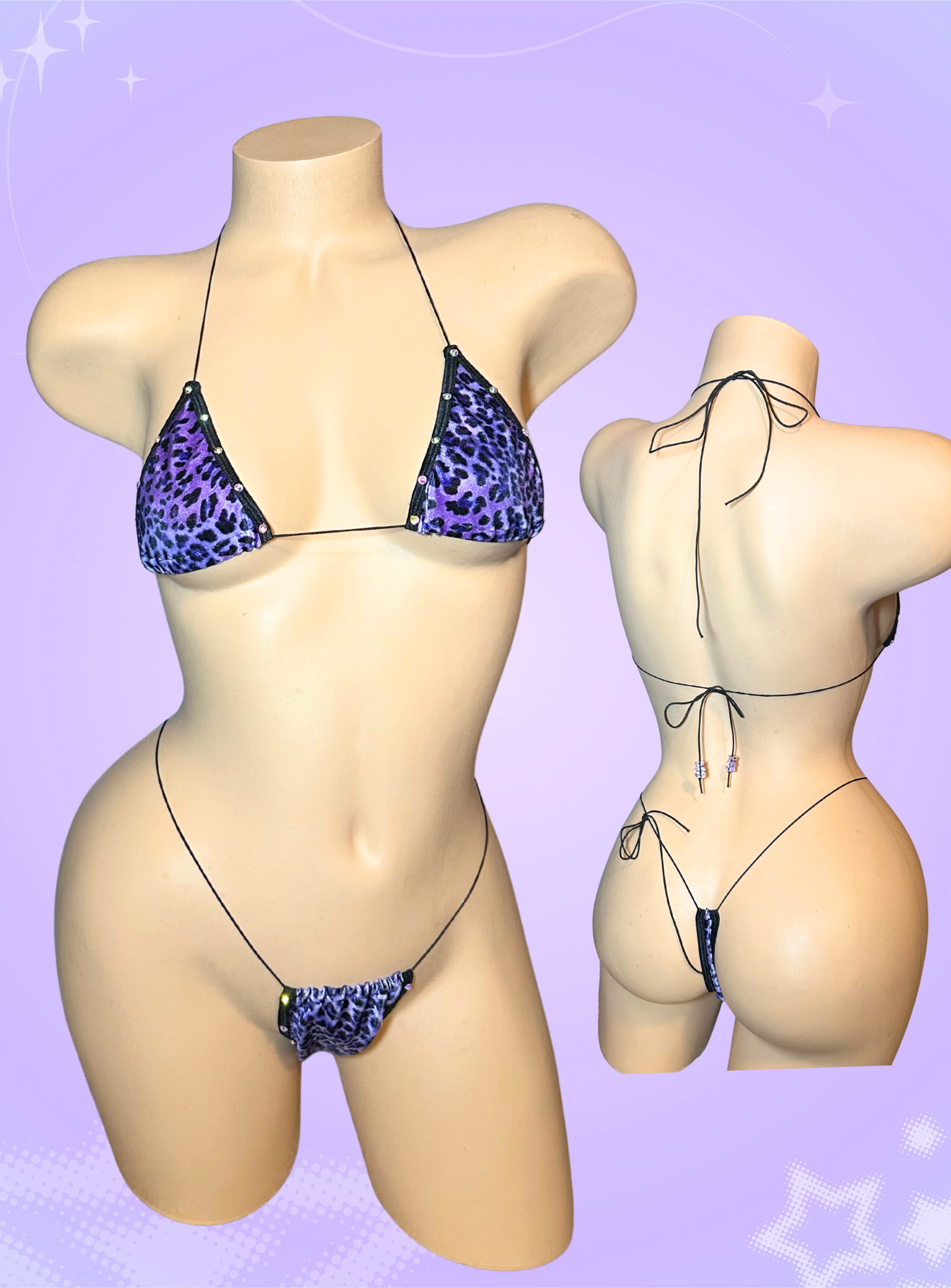 The nova microkini in a purple cheetah print with rhinestones on the edges
