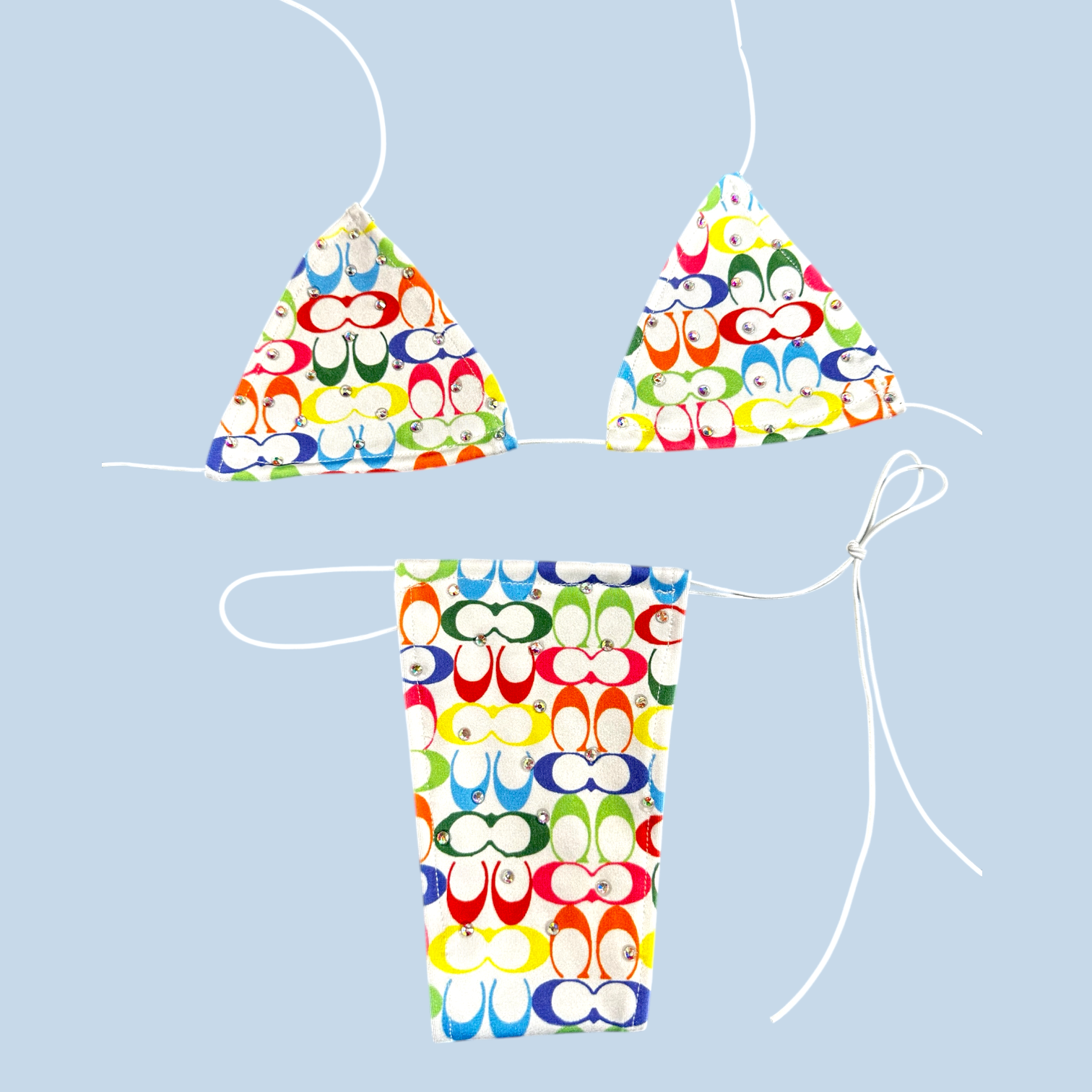 The nova microkini in a white with rainbow designer inspired print and covered in glass rhinestones