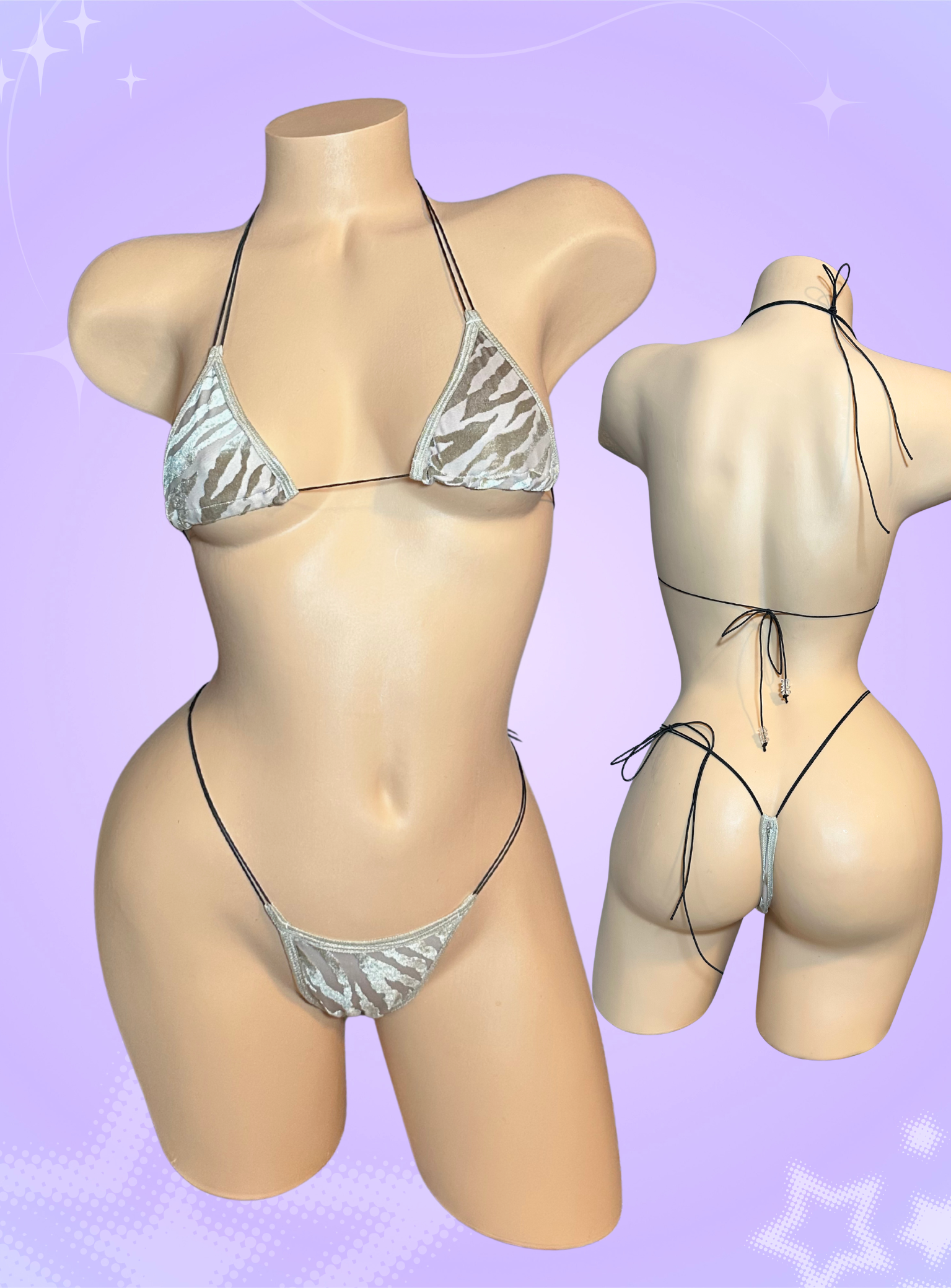 The vixen microkini in a beige burnout velvet tiger print. Fully lined.