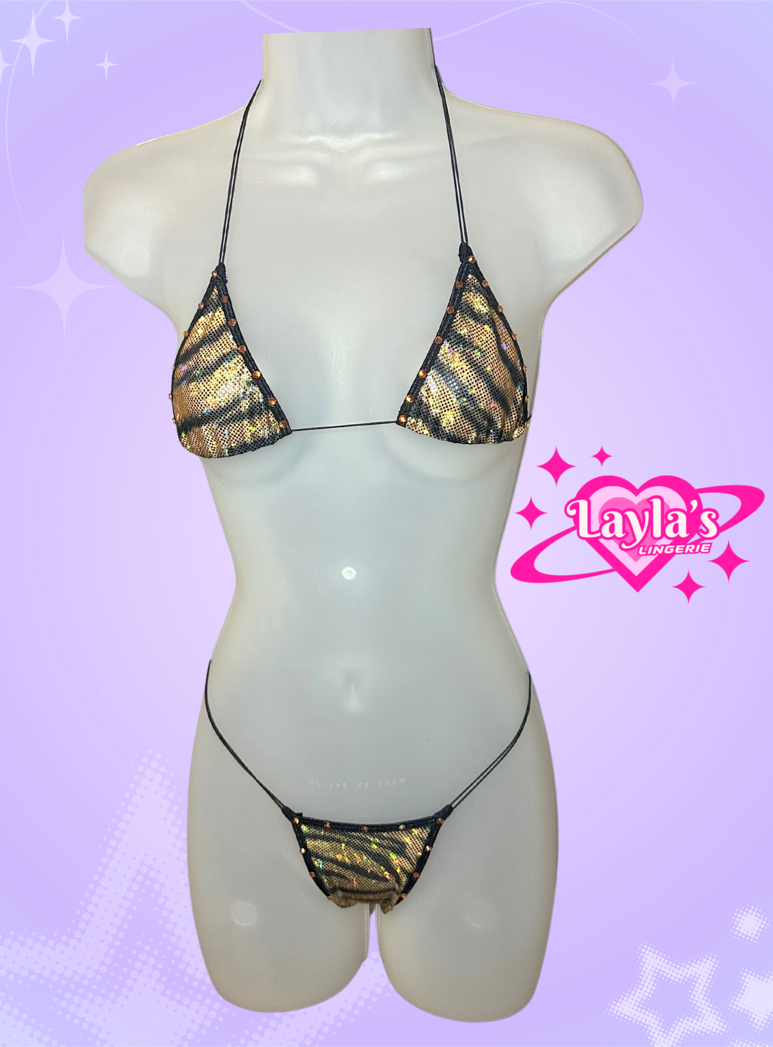 The vixen microkini in a holographic tiger print with rhinestone accents.