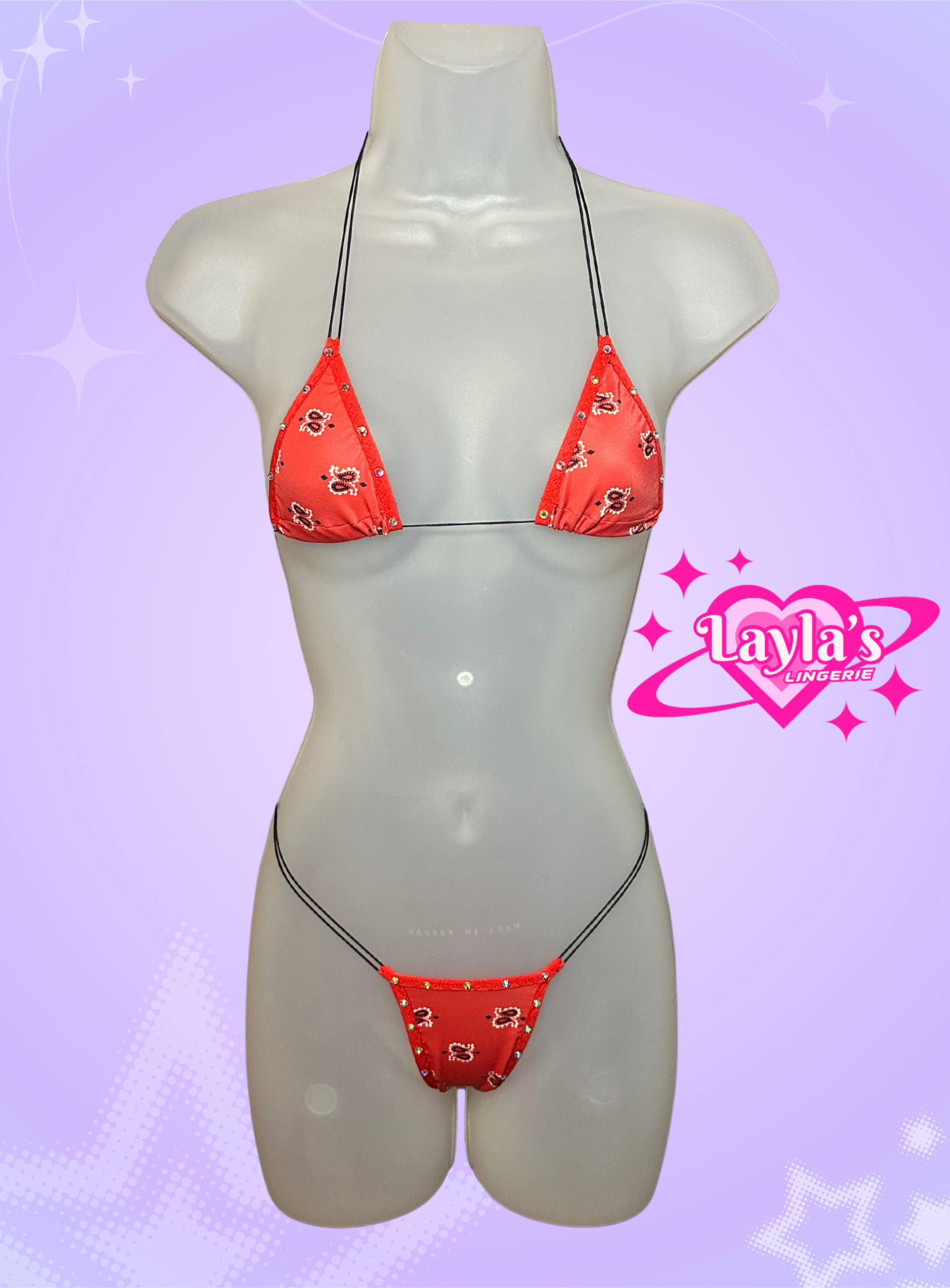 The vixen microkini in a red paisley print with rhinestone accents.
