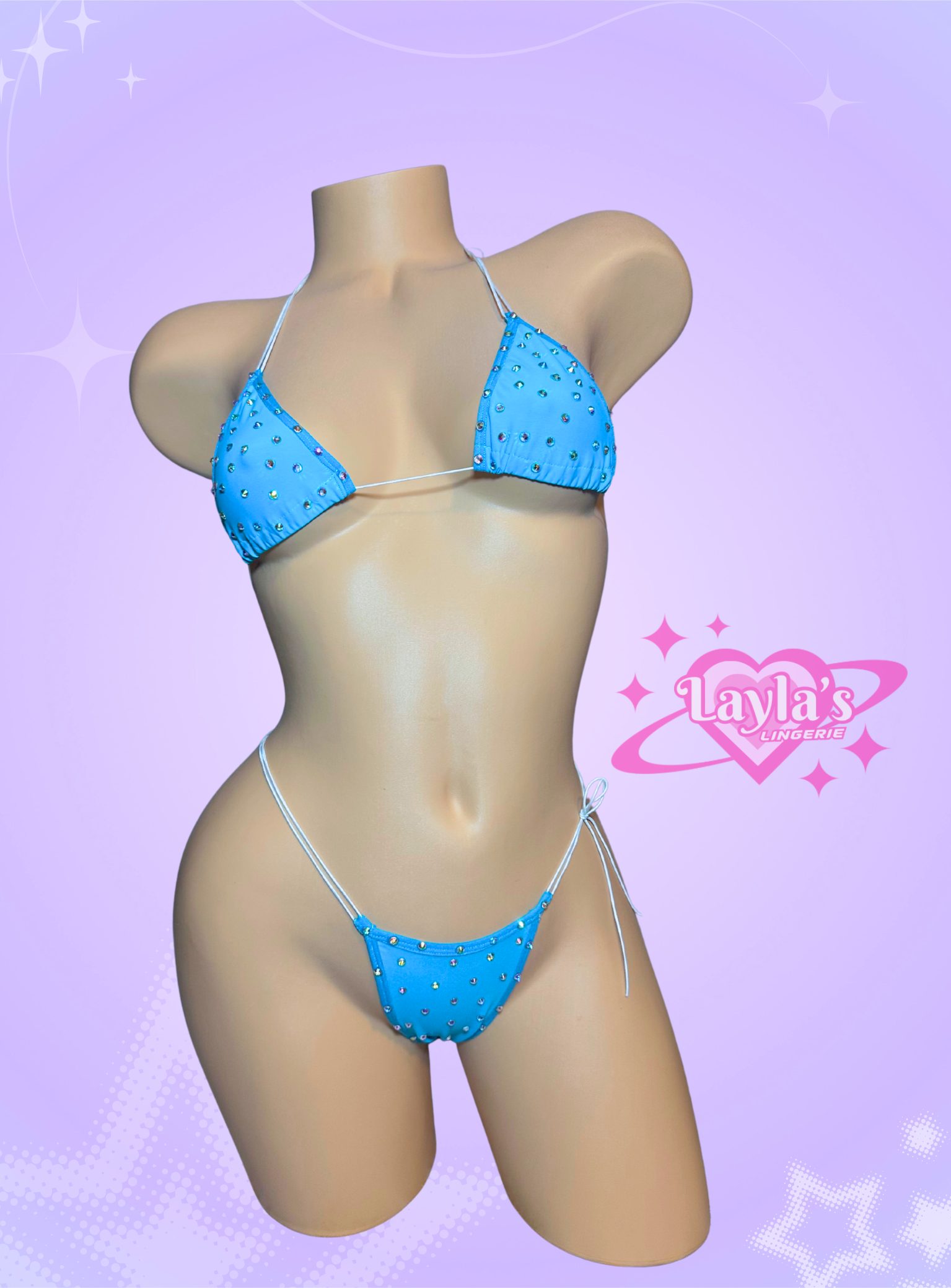 The vixen 2 piece microkini in turquoise with hand-placed rhinestoned covering the bikini. Rhinestone placement will vary slightly on every outfit.