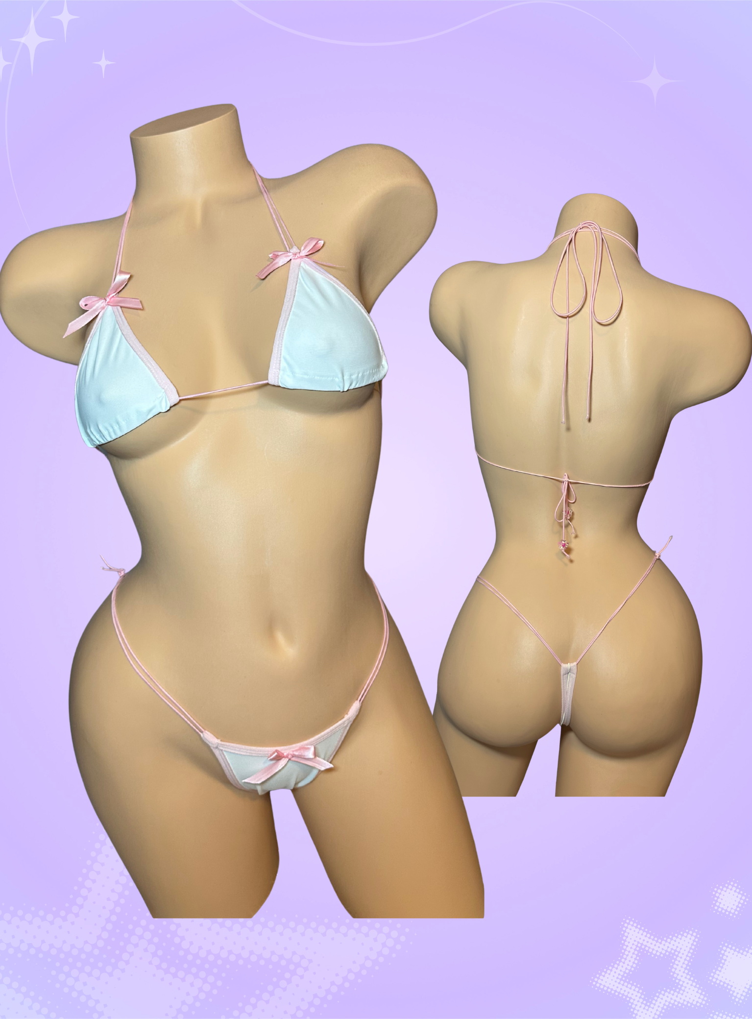 The vixen microkini in white with light pink accents and matching pink bows on each piece. Not intended to be used as swimwear.