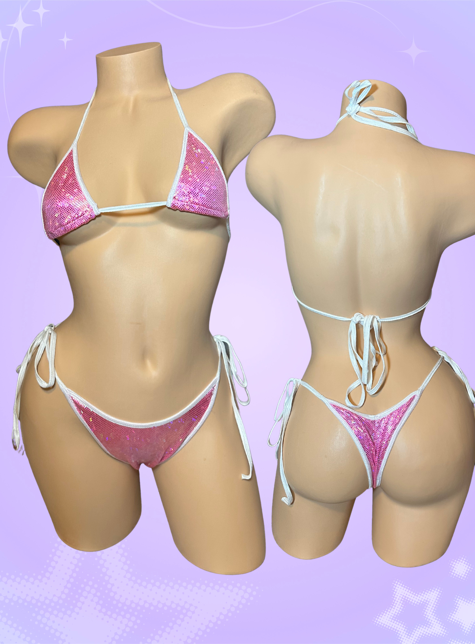 Pink and white cheeky thong bikini two piece with an added scrunched butt. This is lined and made to be used as swimwear. The mannequin is wearing a size XS/S